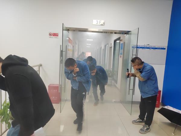 消防疏散演練模擬現(xiàn)場(chǎng)。警報(bào)聲響起,全體員工迅速行動(dòng),彎腰低頭、捂住口鼻,按預(yù)定路線有條不紊穿過“火災(zāi)煙霧現(xiàn)場(chǎng)”。整個(gè)過程中,員工嚴(yán)格遵守要求,冷靜應(yīng)對(duì),展現(xiàn)良好應(yīng)急反應(yīng)能力。