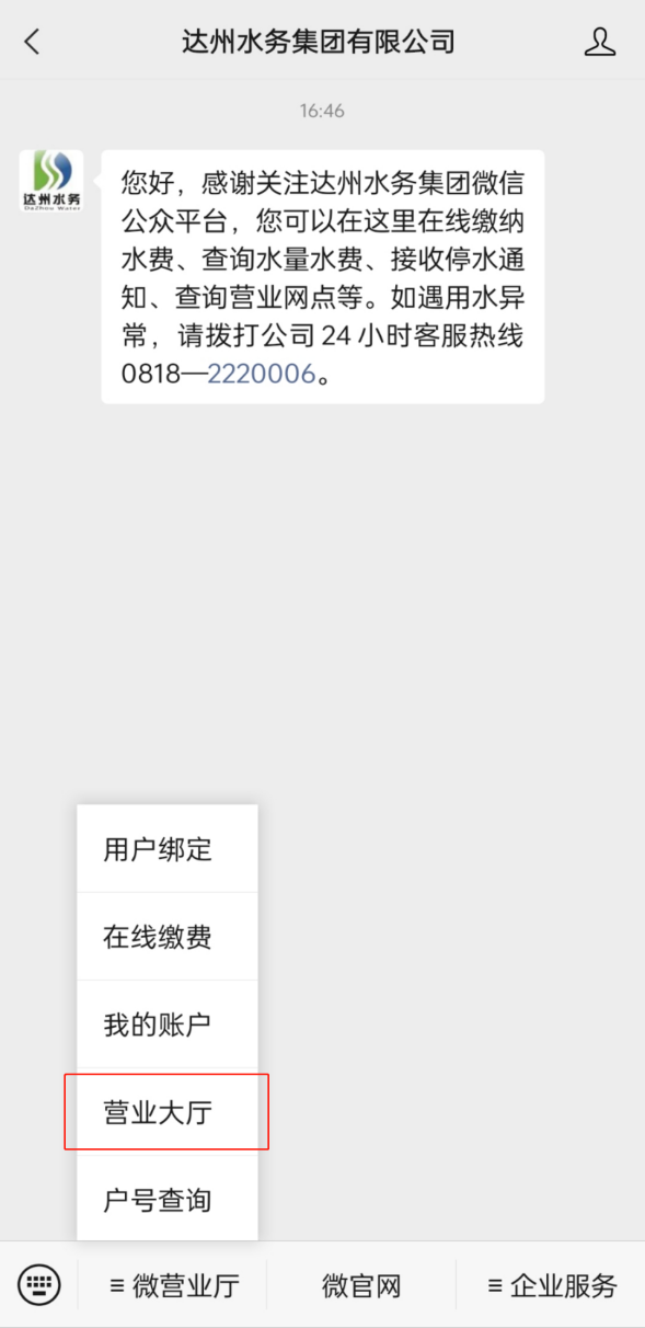 關(guān)注“達(dá)州水務(wù)集團(tuán)有限公司”公眾號,點(diǎn)擊“微營業(yè)廳”中的“營業(yè)大廳”。