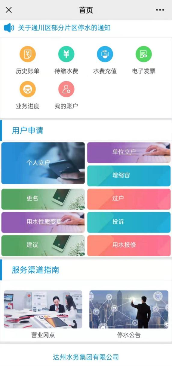 達(dá)州水務(wù)“微營業(yè)廳”已正式進(jìn)駐“達(dá)州水務(wù)集團(tuán)有限公司”微信公眾號,關(guān)注微信公眾號,多項(xiàng)供水業(yè)務(wù)均可網(wǎng)上辦理。用水報(bào)裝、更名過戶、增縮容、用水性質(zhì)變更、用水報(bào)修、水費(fèi)查詢、充值繳費(fèi)、電子發(fā)票下載等業(yè)務(wù)均可“掌上辦”。