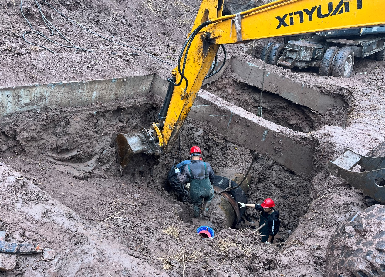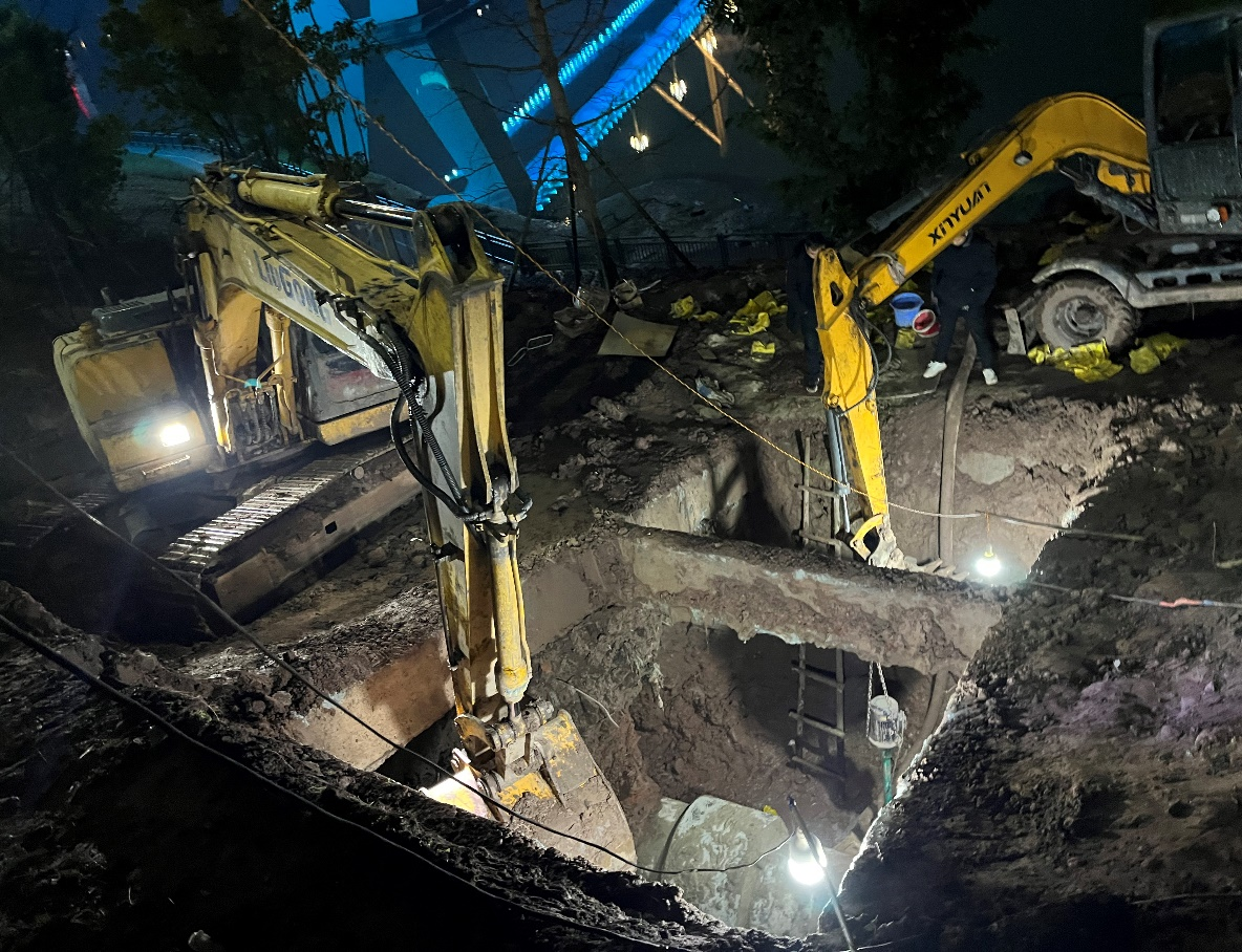 險情發(fā)生后,水務集團黨委高度重視,黨委書記、董事長盧輝帶隊奔赴搶險現(xiàn)場指揮調度,要求惠泉公司立即組織搶修,盡快恢復管網(wǎng)運行,盡最大努力減少污水外溢,集團安全環(huán)保部、規(guī)劃建設部、惠潤達公司到場指導協(xié)助。惠泉公司領導班子立即召開緊急現(xiàn)場會,連夜組織調度搶險人員和設備,出動搶險人員100余人次,挖掘機、吊車、多功能搶險車等工程機械10余臺,合理調配人手,組建臨時班組,采取人機輪班,就地休息的方式,在確保安全的情況下,迅速開展搶險工作。