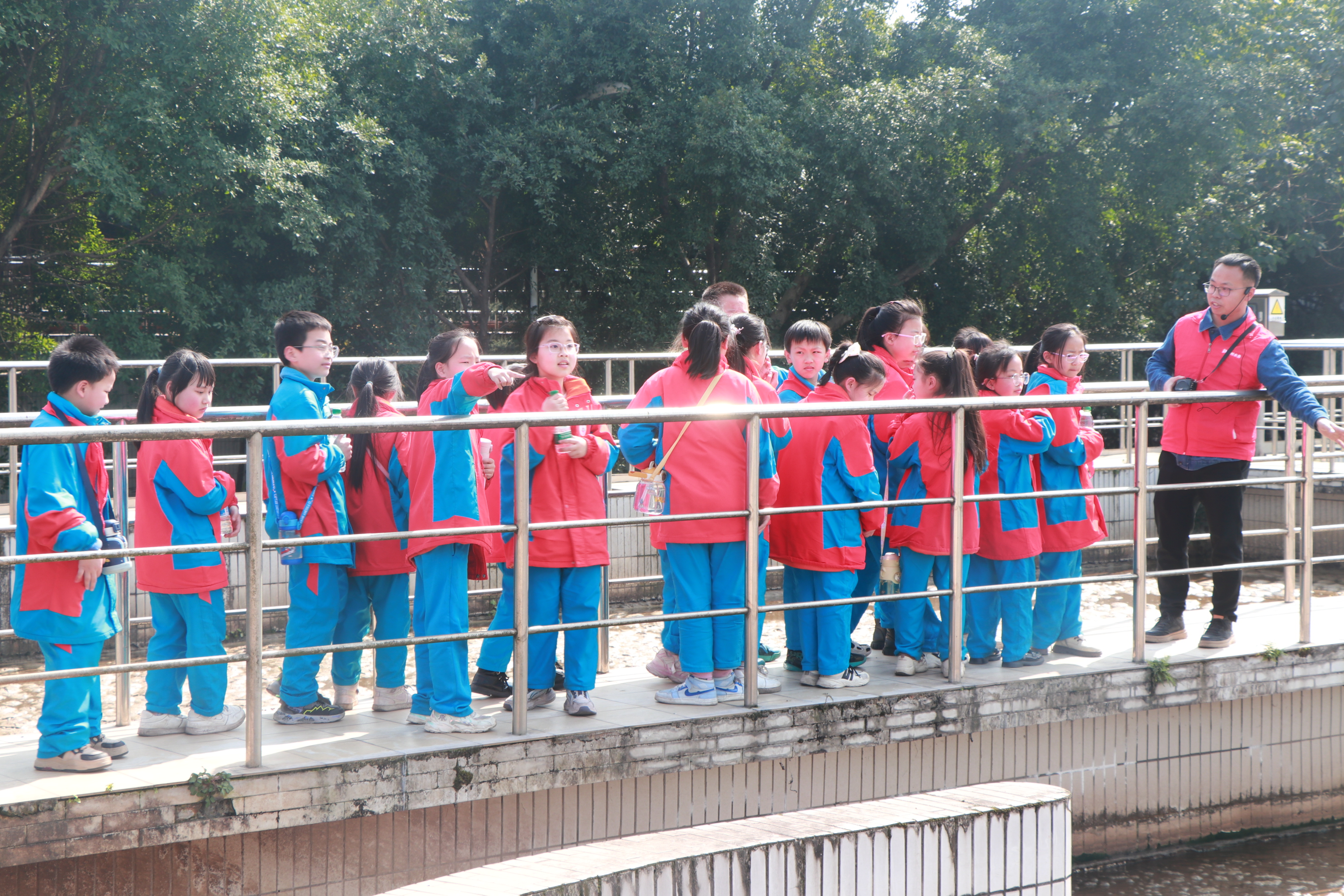 然后的實(shí)地參觀環(huán)節(jié),師生依次走過生化池、二沉池、出水口等區(qū)域。了解生化池里微生物“吃掉”污染物的神奇過程,目睹渾濁污水逐步變成清澈水流,對污水處理的復(fù)雜工藝和神奇效果有了直觀體驗(yàn)。